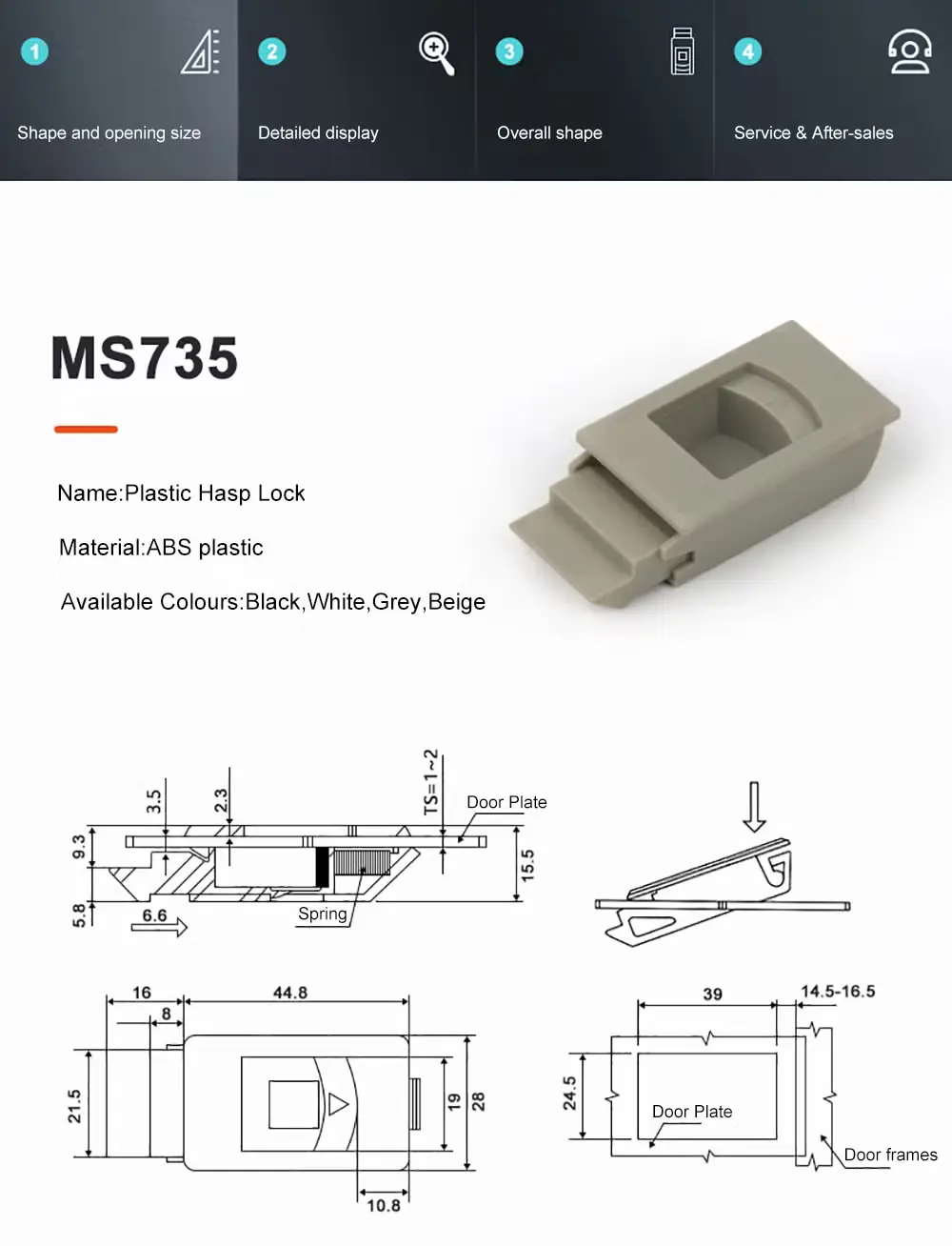 Západka bočních dveří MS735 je vyrobena z vysoce pevného inženýrského plastu s vynikajícím odolností proti korozi, odolností proti nárazu a izolačními vlastnostmi.