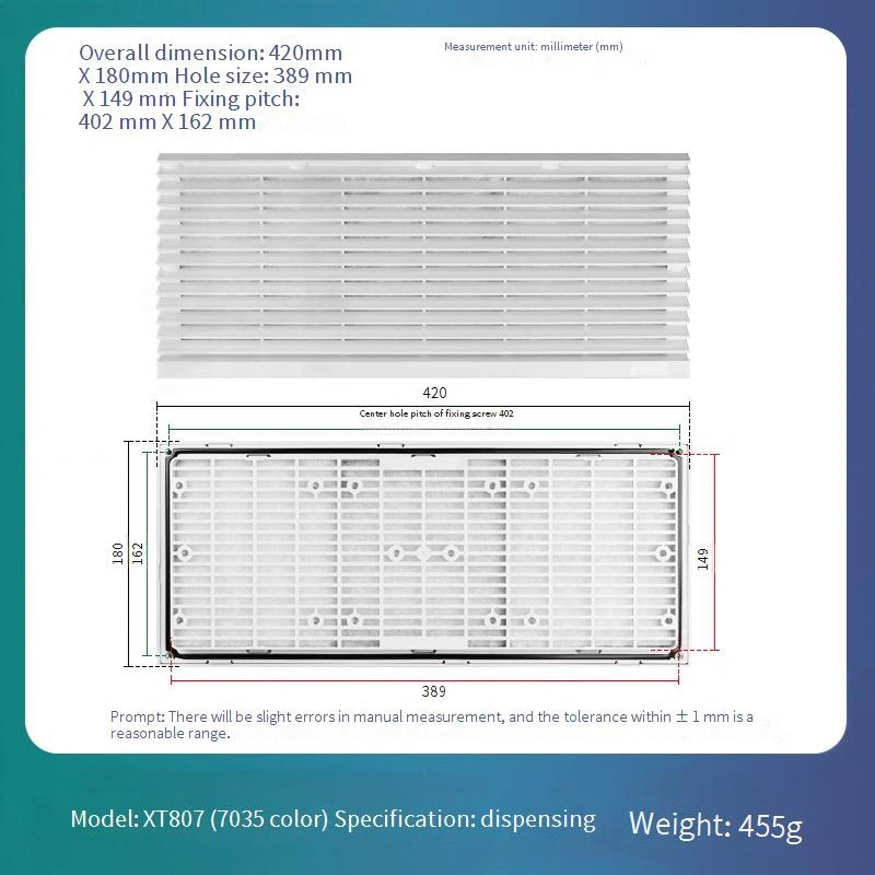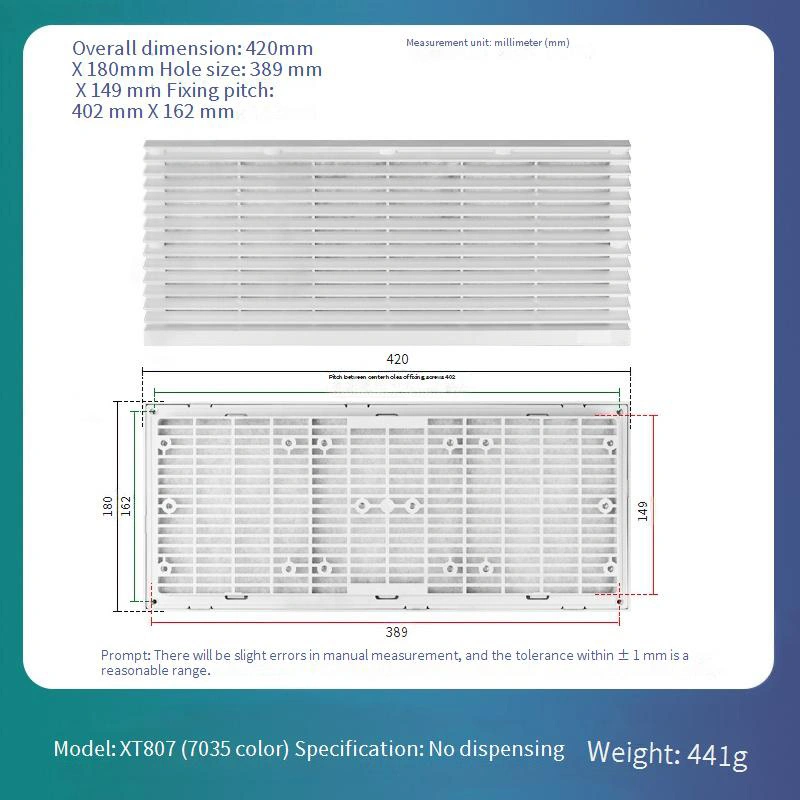 Vyznačuje se vyměnitelný návrh filtru pro snadnou denní údržbu a výměnu, což výrazně snižuje dlouhodobé provozní náklady. Struktura rámečku je k dispozici ve standardní barvě bíle šedých 7035. Je konstruován z materiálu ABS, který nabízí vynikající odolnost proti deformaci, což zajišťuje dlouhodobou stabilitu.